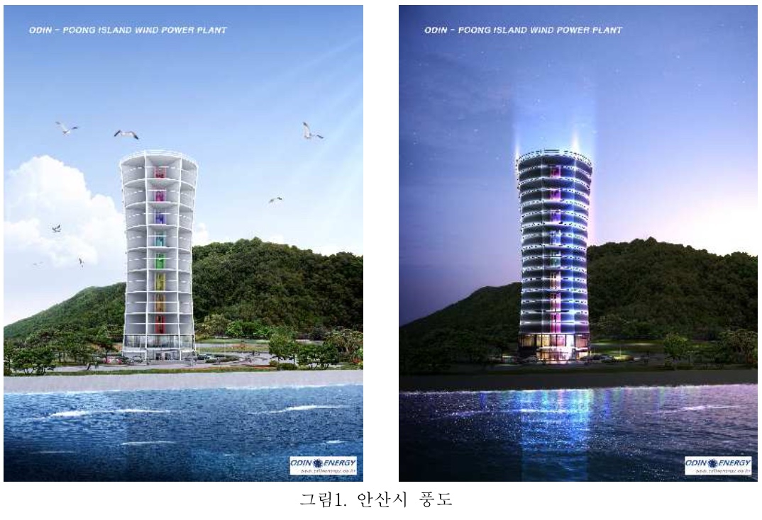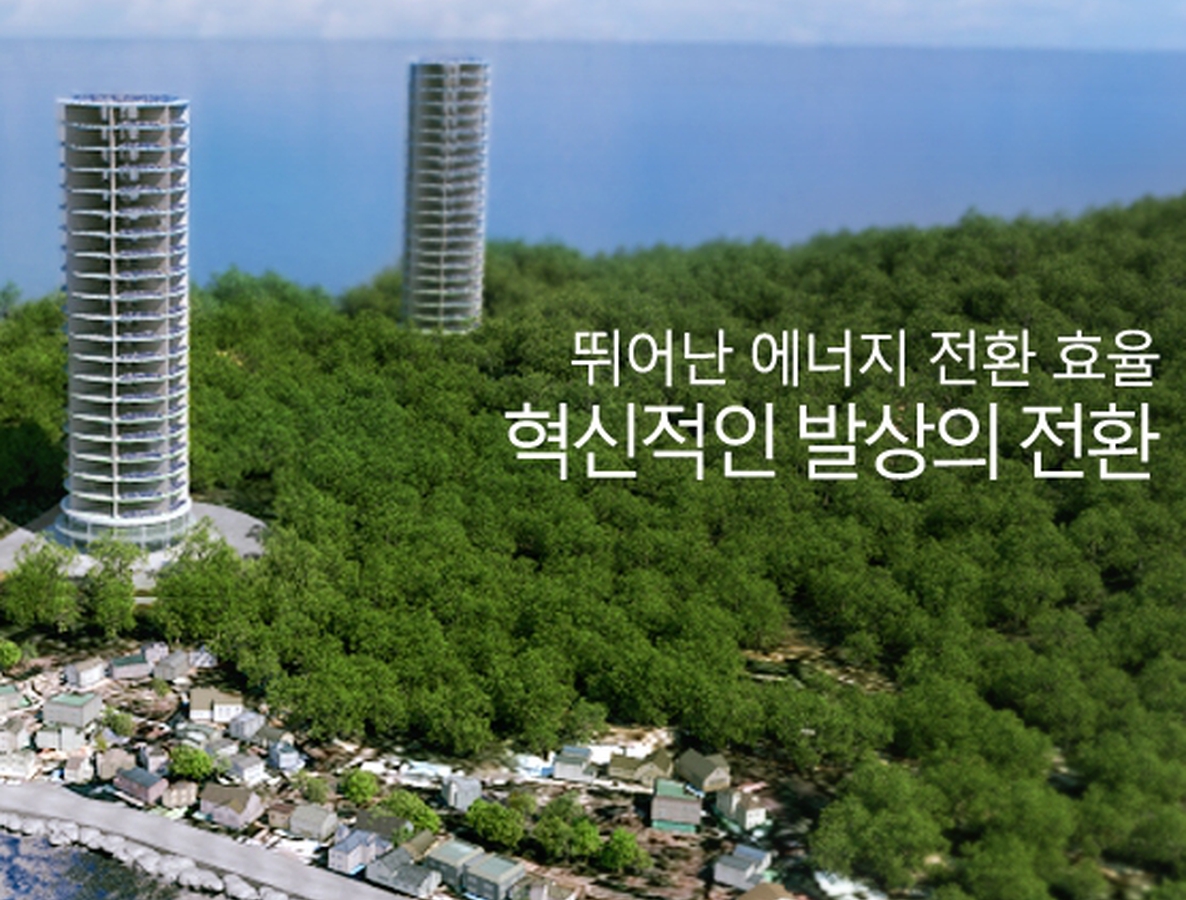 타워 형태로서 가동율이 높으며, 설치 면적이 기존풍력발전 대비 약 1/80로 줄어듭니다. 또한 소음, 진동이 없고 구조가 안정적이어서 건물 위나