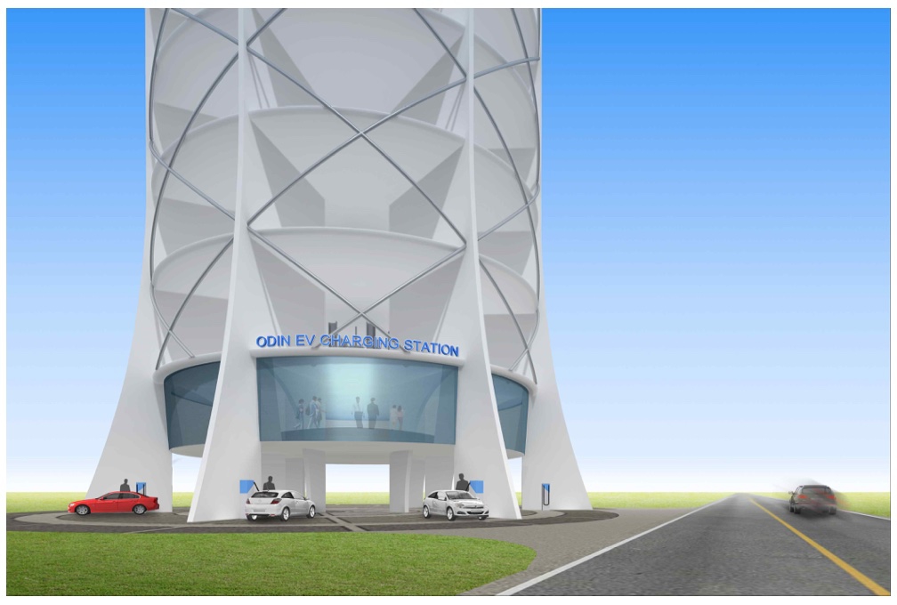 오딘은 원통형 타워 중심부에 적층식으로 풍력발전기를 설치하여